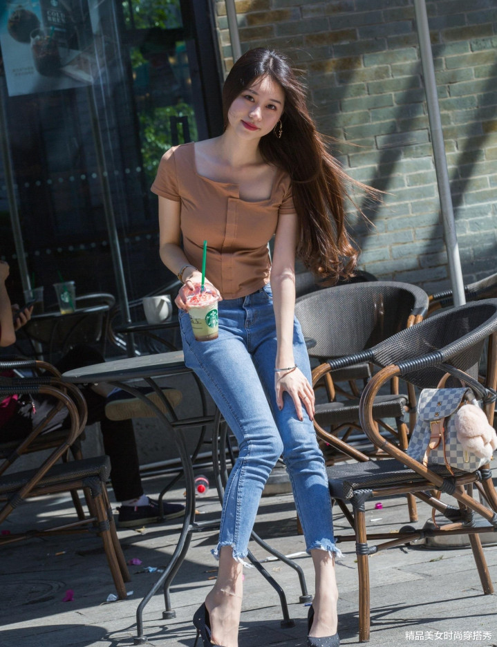 👚上衣选择了一件修身的棕色短袖T恤,不仅显瘦还非常百搭。与浅蓝色牛仔裤的搭配,简直是天作之合,既日常又不失时尚感。